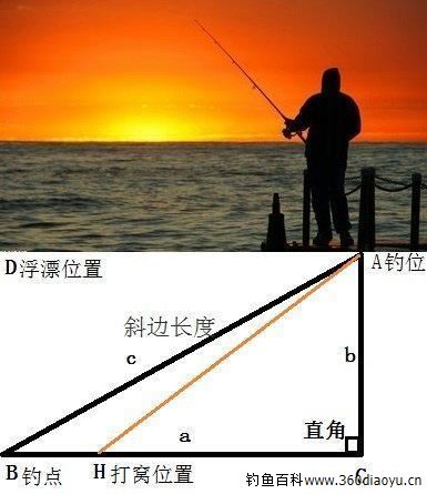 3、简单而快捷知晓AB长度或者钓饵位置(B点)到钓位的距离,也就是直角三角形的斜边长度,就能随意控制或调整窝饵袋 与钓点的距离;同理,知道了绳子长度(钓饵位置B点到钓位的距离),也就知晓了B角的角度(斜坡角度),通过主窝点H和钓饵位置B点的调整,更能随心所 欲,运用自如。本人一般习惯是:4.5米竿水底是平坦的土、田,打窝点H应是钓饵位置B退后1—1.5米;45度斜坡,打窝点H应是钓饵位置B退后2—3 米。