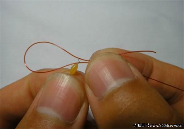 8、主线头节使用时与平常基本相同,同样是先打个马蹄扣,然后将竿稍穿过拉紧即可。不同的是需要将头节上方的那颗太空豆移动到竿稍处锁死即可。