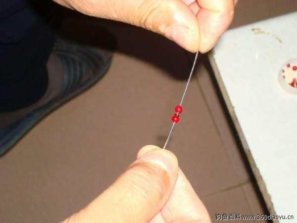 珠子二侧用线按拴鱼钩的方法,把二个珠子固定下来。