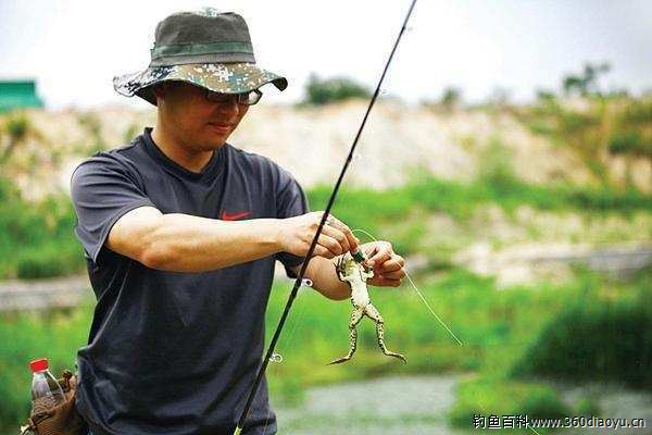 诱饵刚落,六七只牛蛙一齐游向诱饵。一只牛蛙游得最快,猛地一口吞下诱饵。快速收钩,一只半斤重的牛蛙被钓上来。