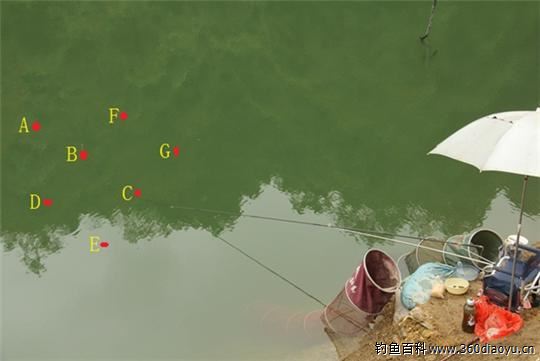 比如在钓位上分别抛A、B、C、D、E、F、G七竿。在正前方抛上三竿,A点是满竿、B点是退后20公分、C点是退后40公分各抛一竿,然后在左右再各抛四竿。 D点是在左距正前方偏30公分抛一竿,E点是退后20公分抛一竿,F点是右距正前方偏30公分抛一竿,G点同理退后20公分抛一竿。