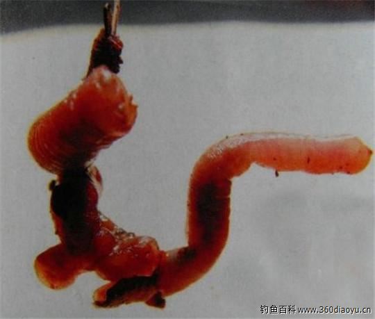 取出一整条蚯蚓,用钩尖在从其腰部横向穿过,只穿一次即可,露出钩尖,也可以同时挂两条或多条,形成团子饵和排挂饵,主要钓鲶鱼等一些凶猛的鱼。