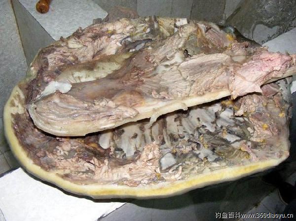 胆子一壮,自己开始收线,入手很重,拉上来是一只脸盆大的大甲鱼。两股钓线已经被咬断一股,再迟些时候,它就会逃掉了,所以我起线正是时候。