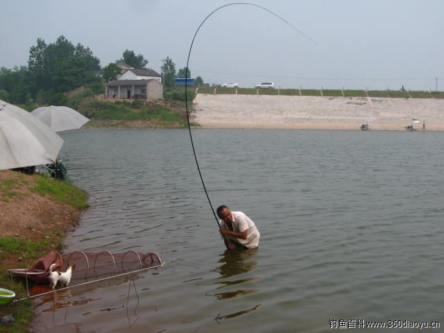10.50中大青鱼到11.40分抄鱼上岸,因没上失手绳,在这50分钟内经历了中鱼,溜鱼,下水溜鱼,断竿,用前三节继续在水中踩水溜鱼,后来溜到岸边用咱的6.3竿现栓一米线单钩挂在断竿的线头处,又继续溜鱼,硬是把这条近30斤的大青鱼溜在岸边,鱼也实没劲了,打它也不动了。