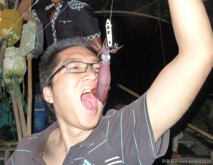 鱿鱼发现饵后,用触足抓住饵往嘴里送,手里的线有较明显的鱼吃食拉线感,这时提手收线。收线时力度要适当,用力过猛会将只挂住触角的将触角拉断。当鱿鱼快出水面,离水面约1米左右时,开始喷墨,黑墨可喷出1米多高,一不小心让它喷到脸上身上,还不好洗掉。当时的感觉一定是这样的!
