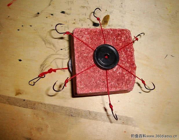 翻板钩的使用:将切割好的豆饼中心的小孔,穿在翻板钩的连接线上;然后将铅坠连上,坠的平整面向着豆饼。海杆线上加装大的接连环,连上翻板钩,有多远就投多远,支好海杆、挂好铃铛等大鱼上钩。 入水后由于含坠一面重量重,下沉得更快,所以翻板钩沉底后带钩的那面是朝上的。糠饼经水浸泡后会一层一层的慢慢脱落,散落在钩的周围,大鱼来吃散散落的糠饼便将钩一并吸入。糠饼气味浓香,在水里可泡上几个小时不会完全溶化,便能长时间的诱鱼,小鱼吃不下钩、闹不了窝。这也是为什么翻板钩上鱼率高、上鱼大的原因。没有糠饼,可以用花生饼或其它炸油的枯饼代替,也可以自己用相关饵料制作。