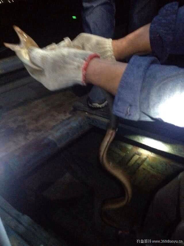 我看潮水已经涨到山水入海的涵洞前,就移到这里,这里此时水深只有70-80公分,我提着线板上下掂动。心中祈祷,鱼儿、鱼儿啊,快来吧可不能叫我做掘腚虫(我们这里称会钓鱼的叫“鱼鸦”,不会钓鱼或钓不到鱼叫“掘腚虫”)。忽然手上有一大力拉扯的感觉,而且力量很大,哈!上鱼了,真是皇天不负有心人,心想一定是一条不小的鱼,用力向上一提,只见一条足有一米,近二斤重的海鳗飞上了岸,怪不得力量这么大。钩被吃进喉部,海鳗身上很滑腻,非常难抓,好不容易才将鱼钩拿出来。接下来又钓了四条海鳗,还有一条钻进石缝将钓线拉断。
