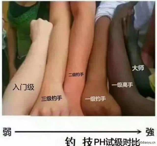 夏季钓鱼,最容易受伤,也是最大的伤害是皮肤,我们看到许多钓友皮肤很黑,这是轻的,以前看到一幅图,上面是五条肤色由浅至深的胳膊,最深的那就是骨灰级的玩家啦。其实,这幅图少画了一个,有一些出勤天数很高的钓友,皮肤是黑一块褐一块的,肤色不均匀。更深的,有被晒掉头发的,三伏天去库钓,打伞戴帽子也没用,头皮会被晒伤。