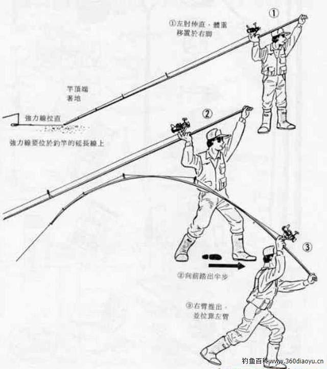 大物上钩后都会有很大的力要线,这时要沉着和冷静,把竿的弓要打好,绝对不能同大物拔河,充分利用海竿的自身调性和正确的溜鱼方法来搏击水下大物。