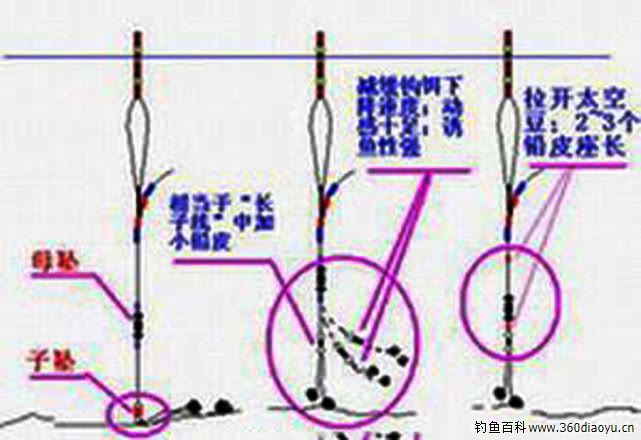 在小杂鱼闹得比较厉害时,选用这种钓法,可以更好地避免,小杂鱼吃饵时的杂乱信号。铅坠是立着触地的,饵的自重不在线组的平衡系统内,在小鱼吃饵时牵动鱼饵时,往往拉不动铅坠。