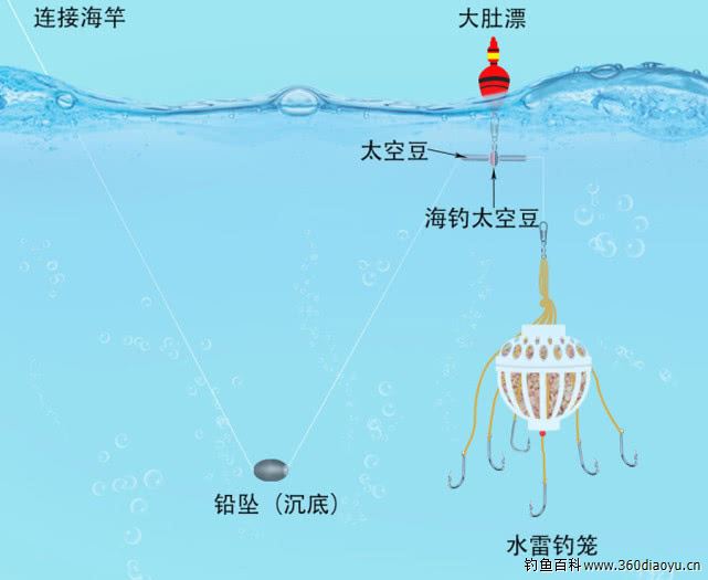 3米长的海竿及普通线轮即可。主线粗一些为好,3-6号均可。铅坠用算盘珠形的,中间孔大,便于滑过太空豆。组装时在主线上依次穿上太空豆、铅坠、浮漂,主线末端打出一个留有挂水怪的线圈的结,就大功告成了。